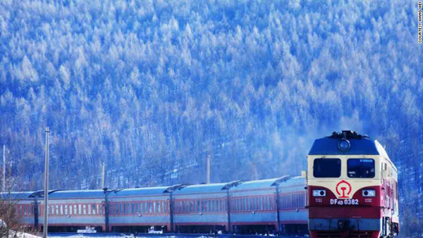 | The photo shows a K1301 train running in snowy forest.(Photo/Wang Wei) |