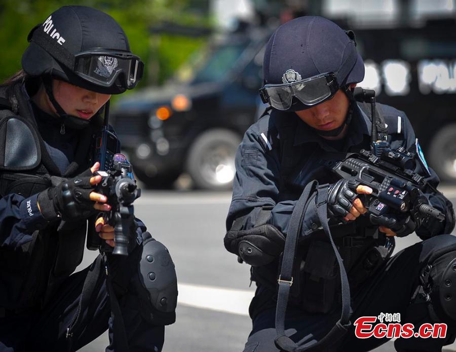 Special Police try a multifunctional support for the QSZ-92 pistol in Urumqi city, capital of Northwest China’s Xinjiang Uygur autonomous region, June 9, 2015. The newly developed gun support, made of high-strength composite, can improve the precision and stability of the semi-automatic QSZ-92 pistol.