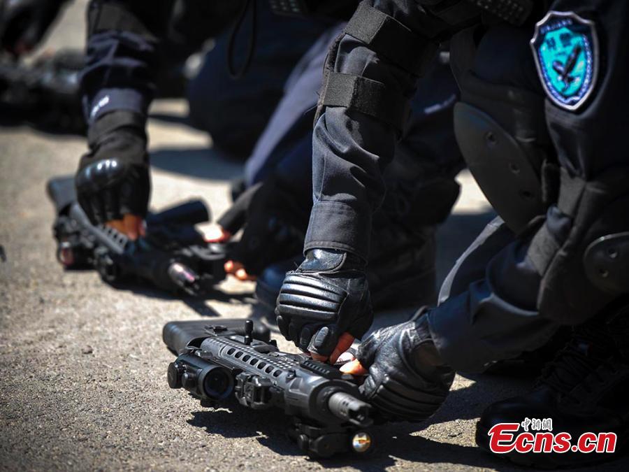 Special Police try a multifunctional support for the QSZ-92 pistol in Urumqi city, capital of Northwest China’s Xinjiang Uygur autonomous region, June 9, 2015. The newly developed gun support, made of high-strength composite, can improve the precision and stability of the semi-automatic QSZ-92 pistol.