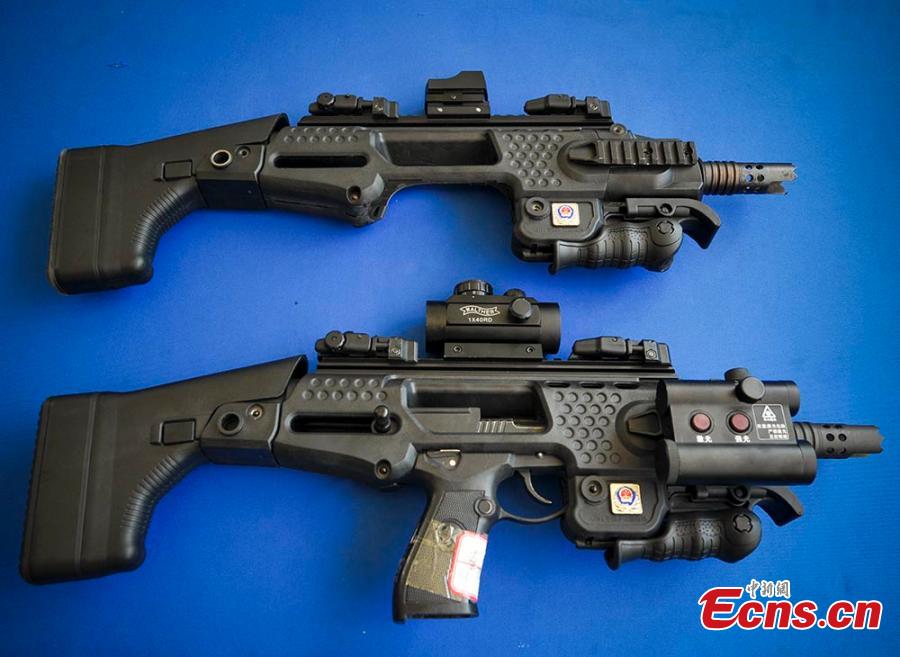 Special Police try a multifunctional support for the QSZ-92 pistol in Urumqi city, capital of Northwest China’s Xinjiang Uygur autonomous region, June 9, 2015. The newly developed gun support, made of high-strength composite, can improve the precision and stability of the semi-automatic QSZ-92 pistol.