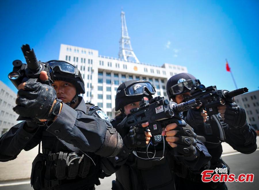 Special Police try a multifunctional support for the QSZ-92 pistol in Urumqi city, capital of Northwest China’s Xinjiang Uygur autonomous region, June 9, 2015. The newly developed gun support, made of high-strength composite, can improve the precision and stability of the semi-automatic QSZ-92 pistol.