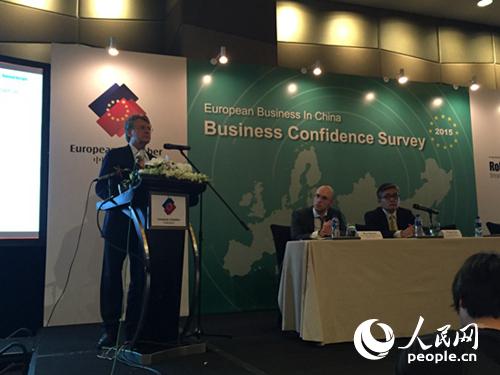 | European Chamber President J?rg Wuttke makes the presentation. (People's Daily Online/Xinyu Yao) |