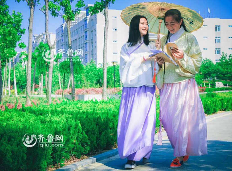 Several students of Shandong Business Institute cerebrate the upcoming Dragon Boat Festival with a Hanfu show. (Photo/ Iqilu.com)