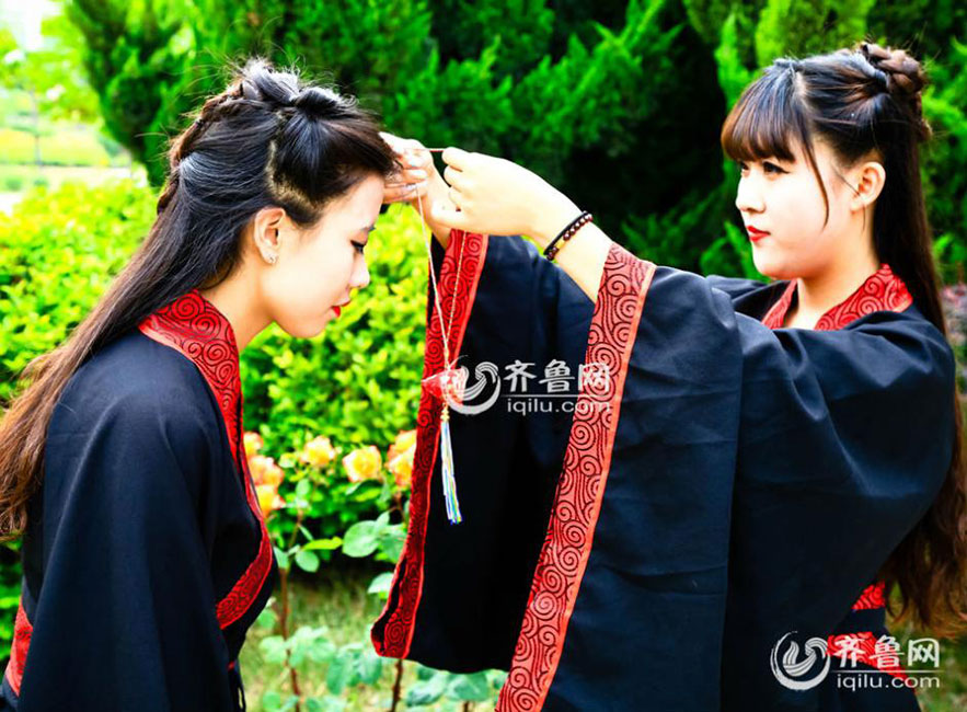Several students of Shandong Business Institute celebrated the upcoming Dragon Boat Festival with a Hanfu show. They took a series of photos, presenting the sachets, five-colored ropes and traditional Han Chinese Clothing.