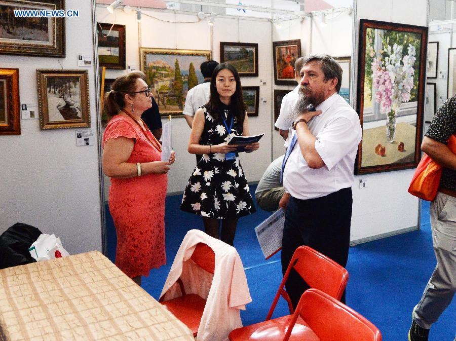 A Russian painter (1st, R) views oil paintings at the 2015 China-Russia Cultural Exhibition in Harbin, capital of northeast China's Heilongjiang Province, June 11, 2015. (Xinhua/Wang Kai)