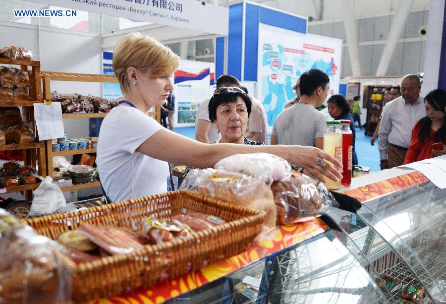 Russians select food during the 2015 China-Russia Cultural Exhibition in Harbin, capital of northeast China's Heilongjiang Province, June 11, 2015. (Xinhua/Wang Kai)