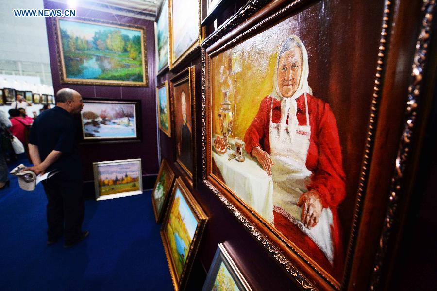 A man enjoys oil paintings during the 2015 China-Russia Cultural Exhibition in Harbin, capital of northeast China's Heilongjiang Province, June 11, 2015. (Xinhua/Wang Kai)