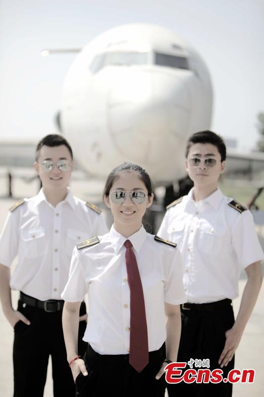 Graduates of the Civil Aviation University of China pose for a graduation photo in Tianjin, June 11, 2015. The graduates include three female pilots. (Photo: China News Service/Tong Yu)