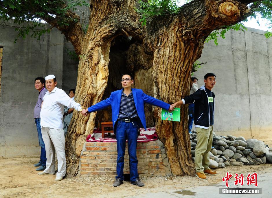 Villagers set up a tea table inside an 800-year-old tree in Ahetan village of Hualong county, northwest China’s Qinghai province on June 10, 2015. (Chinanews/Jiang Yaqin)
