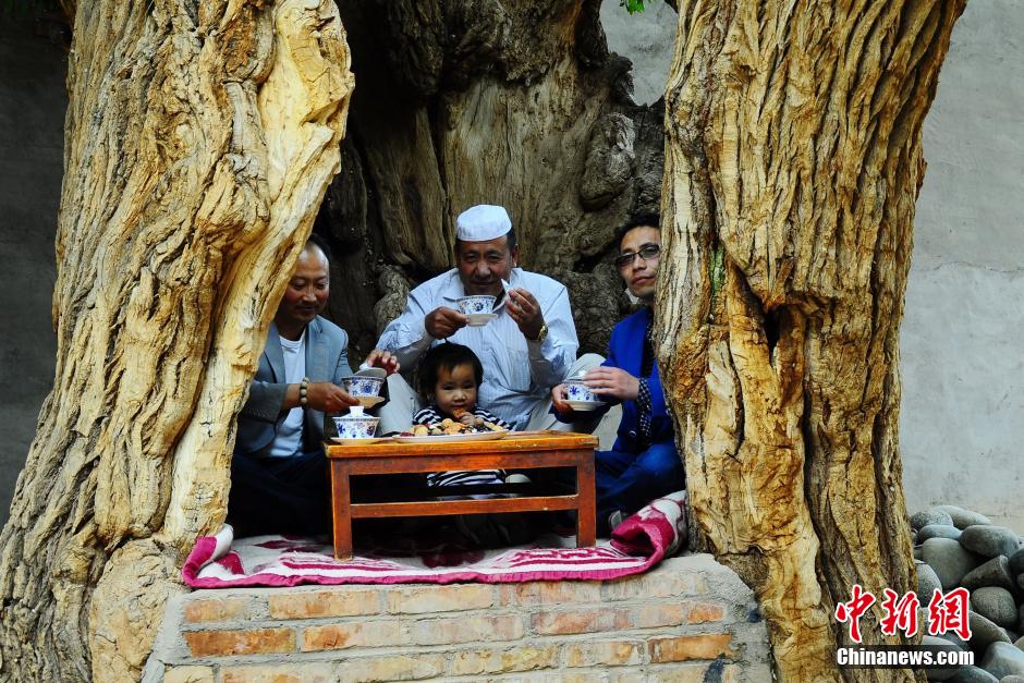 Villagers set up a tea table inside an 800-year-old tree in Ahetan village of Hualong county, northwest China’s Qinghai province on June 10, 2015. (Chinanews/Jiang Yaqin)