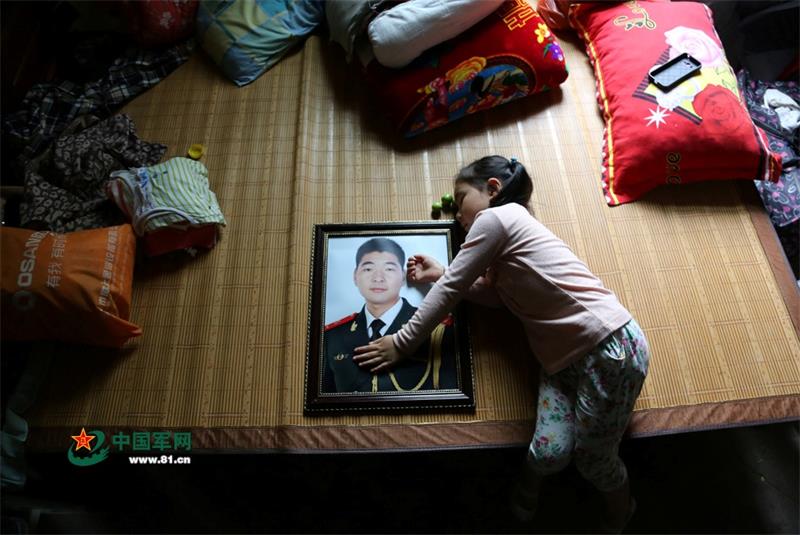 Xu Yuan, 29, is a non-commissioned officer. He was diagnosed with advanced gastric cancer just three months before his discharge from the army. At that time, he expressed a wish to donate his corneas. The photo shows his four-year-old daughter lying on bed with her hands on a photo of her father, calling her father. This little girl does not know what death is.(Photo/81.cn)