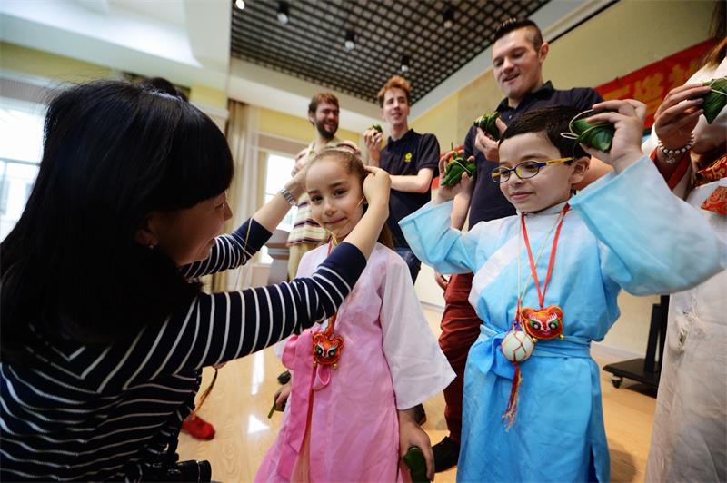 Before the Dragon Boat Festival, foreign families were invited to join with Chinese kids to make zongzi in No.2 Kindergarten under Yangzhou University, east China's Jiangsu Province.(Photo/Xinhua)