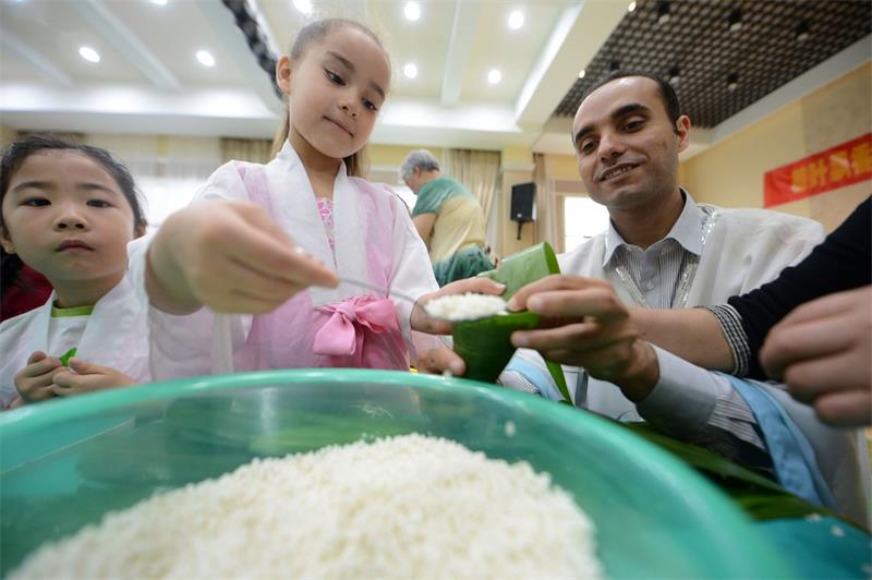 Before the Dragon Boat Festival, foreign families were invited to join with Chinese kids to make zongzi in No.2 Kindergarten under Yangzhou University, east China's Jiangsu Province.(Photo/Xinhua)