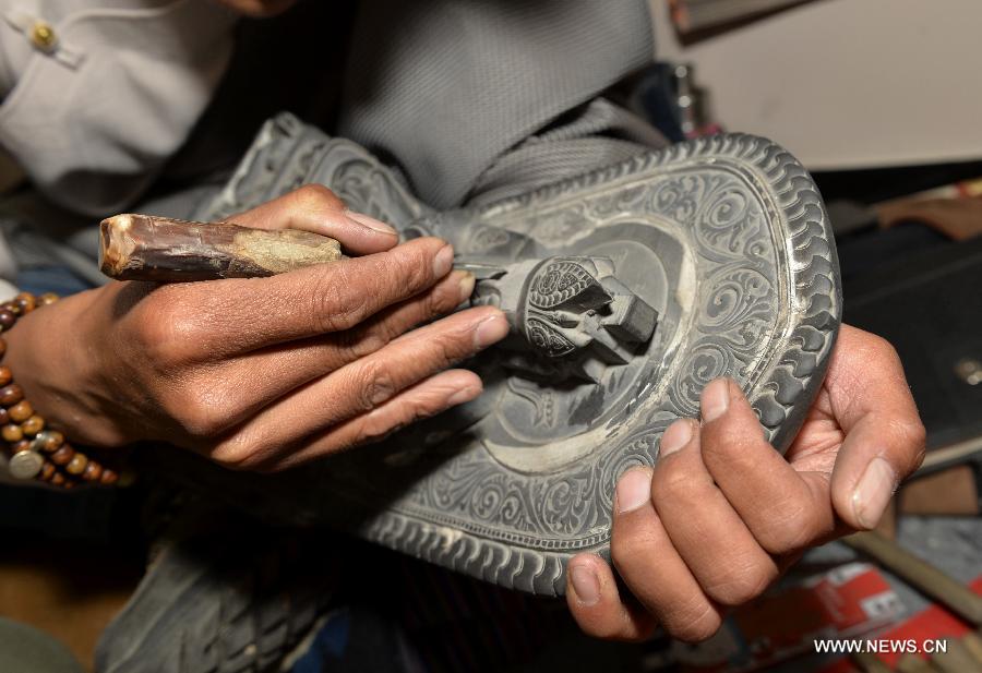 A craftsman shows the art of stone carving at an exhibition of Tibetan intangible cultural heritages in Lhasa, southwest China's Tibet Autonomous Region, June 12, 2015. The second exhibition on the protection of Tibetan intangible cultural heritages was held in Lhasa Friday. (Xinhua/Liu Dongjun)