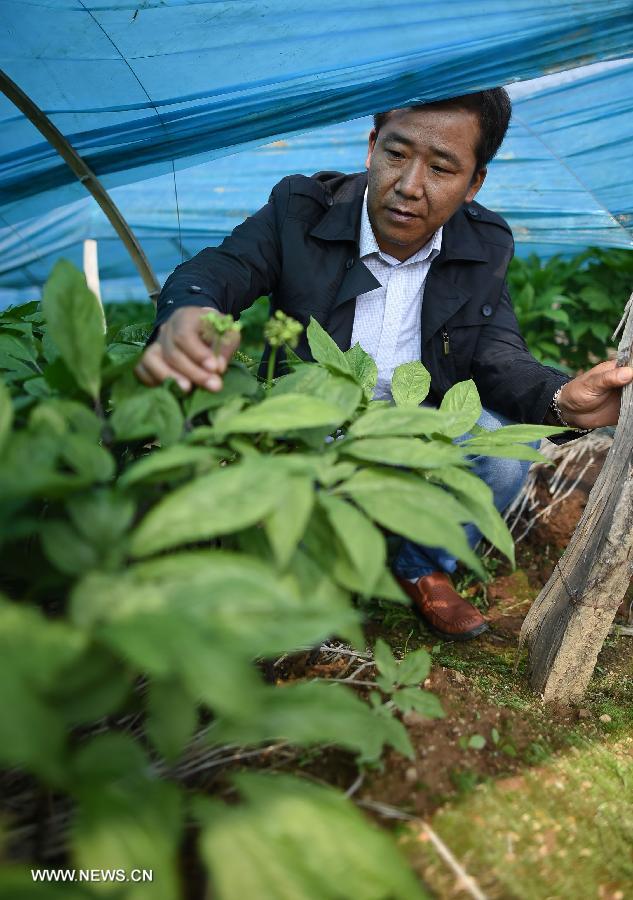 Zhu Guilin, a villager, takes care of ginsengs at Yulin Village in Ji'an, northeast China's Jilin Province, June 11, 2015. China has a long history of cultivating ginseng, which is considered to be nutritious and to have medicinal value in traditional Chinese medicine. Considered as the world's largest ginseng production area, Jilin produces about 85 percent of China's total ginseng output and 70 percent of the world's output. More than 98 percent of ginseng in Jilin is currently cultivated, not grown in the wild. (Xinhua/Wang Haofei)