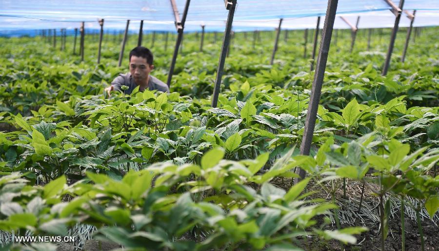 Lin Chengri, a villager, takes care of ginsengs at Shuangcha Village in Ji'an, northeast China's Jilin Province, June 11, 2015. China has a long history of cultivating ginseng, which is considered to be nutritious and to have medicinal value in traditional Chinese medicine. Considered as the world's largest ginseng production area, Jilin produces about 85 percent of China's total ginseng output and 70 percent of the world's output. More than 98 percent of ginseng in Jilin is currently cultivated, not grown in the wild. (Xinhua/Wang Haofei)