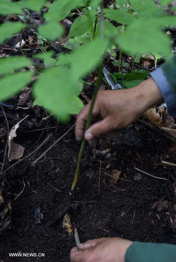 Wang Benjie, a villager, shows woods-grown ginsengs at Shihu Village in Ji'an, northeast China's Jilin Province, June 10, 2015. China has a long history of cultivating ginseng, which is considered to be nutritious and to have medicinal value in traditional Chinese medicine. Considered as the world's largest ginseng production area, Jilin produces about 85 percent of China's total ginseng output and 70 percent of the world's output. More than 98 percent of ginseng in Jilin is currently cultivated, not grown in the wild. (Xinhua/Wang Haofei)