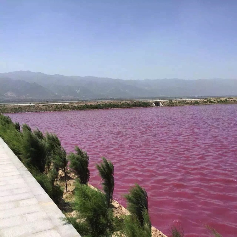 The water turns pink in a salt lake in Yuncheng city, North China’s Shanxi province, June 11, 2015. People can float on the lake’s surface due to the water’s high salinity, which has earned the lake the name "China's Dead Sea.” People having been extracting salt crystals from the lake for over 4,000 years.(Source: Cina.org.cn)