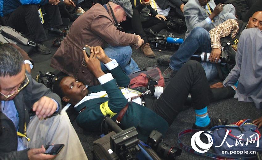 Staff wait at the scene for the group photo session of presenting heads of African states and government, during the 25th Summit of the African Union under the official theme of the "Year of Women's Empowerment and Development”, in Johannesburg on June 14th, 2015. (People’s Daily Online / Zhang Jiexian)