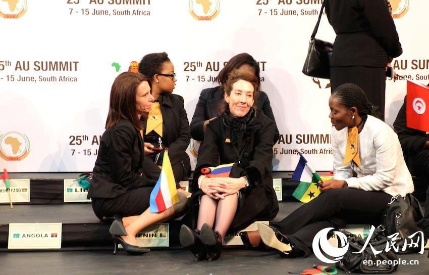 Staff wait at the scene for the group photo session of presenting heads of African states and government, during the 25th Summit of the African Union under the official theme of the "Year of Women's Empowerment and Development”, in Johannesburg on June 14th, 2015. (People’s Daily Online / Zhang Jiexian)