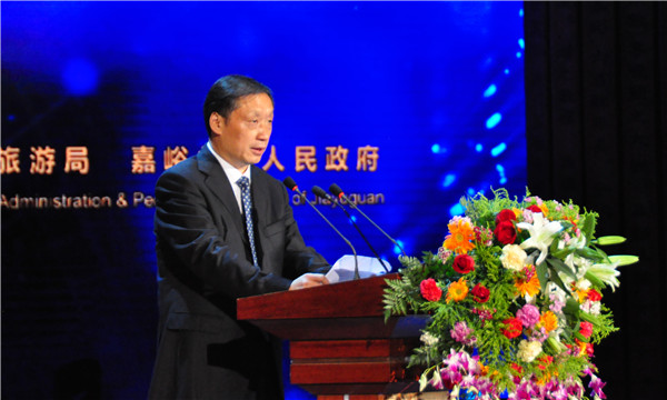 | Li Jinzao, Chairman of China’s National Tourism Administration addresses the opening ceremony of the Fifth Dunhuang Tour-Silk Road International Tourism Festival. (People’s Daily Online/Zhang Yuan) |