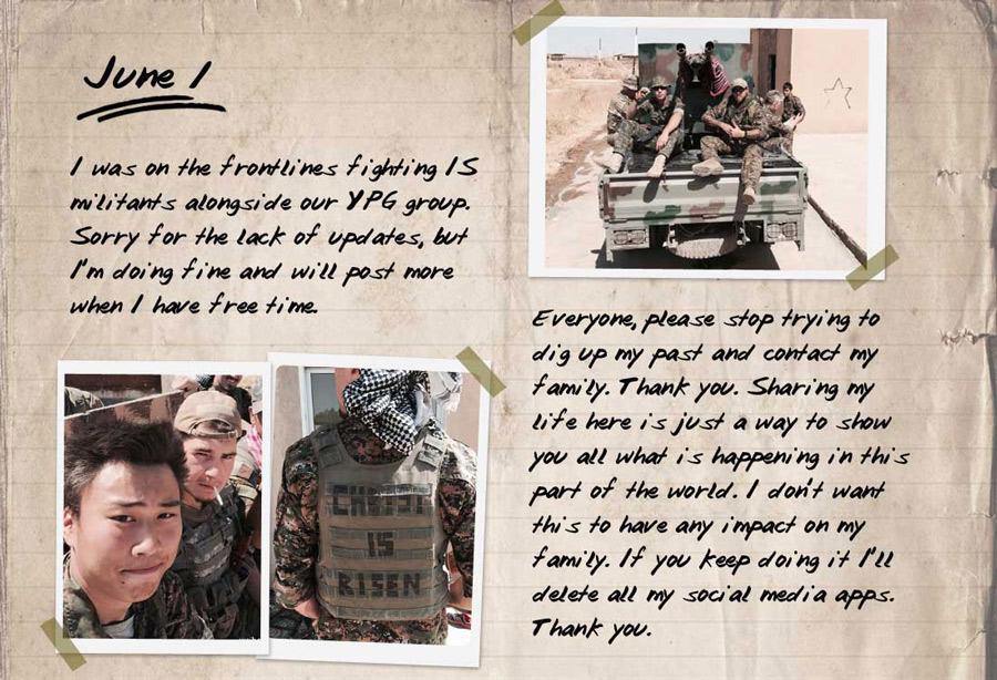 Huang Lei, 23, is one of hundreds of international fighters helping Kurdish forces engage the Islamic State in Iraq and al-Sham (ISIS) in northern Syria, near the border of Turkey.