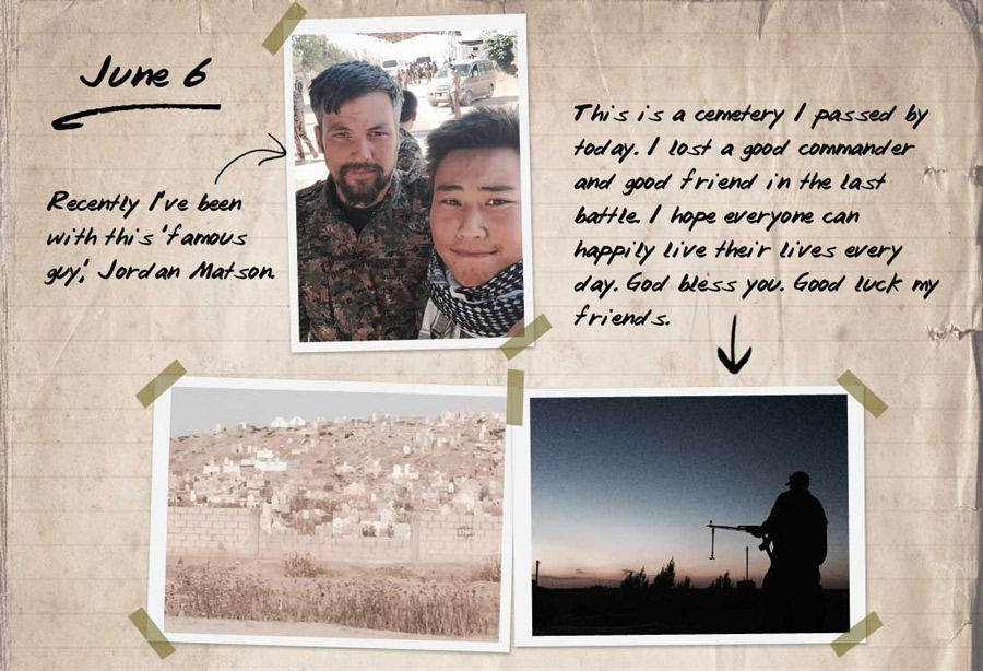 Huang Lei, 23, is one of hundreds of international fighters helping Kurdish forces engage the Islamic State in Iraq and al-Sham (ISIS) in northern Syria, near the border of Turkey.