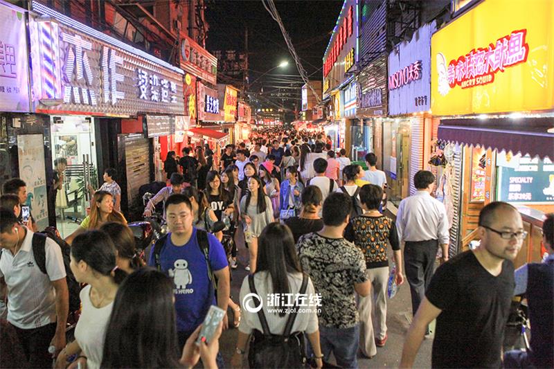 An area dubbed "Bargain Street" sees floods of people frequenting food stands, fast-food chains, Chinese restaurants, western restaurants and clothing stores in Hangzhou, east China's Zhejiang province.(Photo/zjol.com.cn)