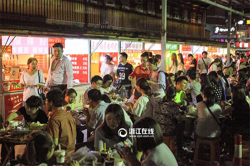 An area dubbed "Bargain Street" sees floods of people frequenting food stands, fast-food chains, Chinese restaurants, western restaurants and clothing stores in Hangzhou, east China's Zhejiang province.(Photo/zjol.com.cn)