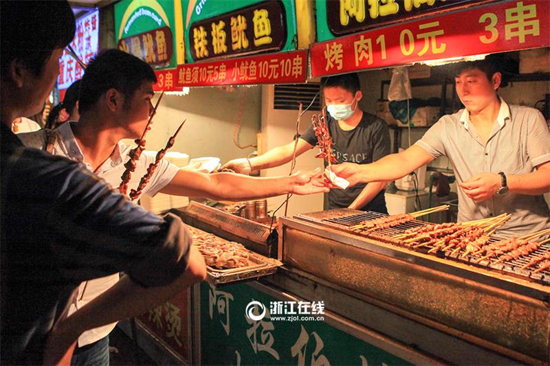 An area dubbed "Bargain Street" sees floods of people frequenting food stands, fast-food chains, Chinese restaurants, western restaurants and clothing stores in Hangzhou, east China's Zhejiang province.(Photo/zjol.com.cn)