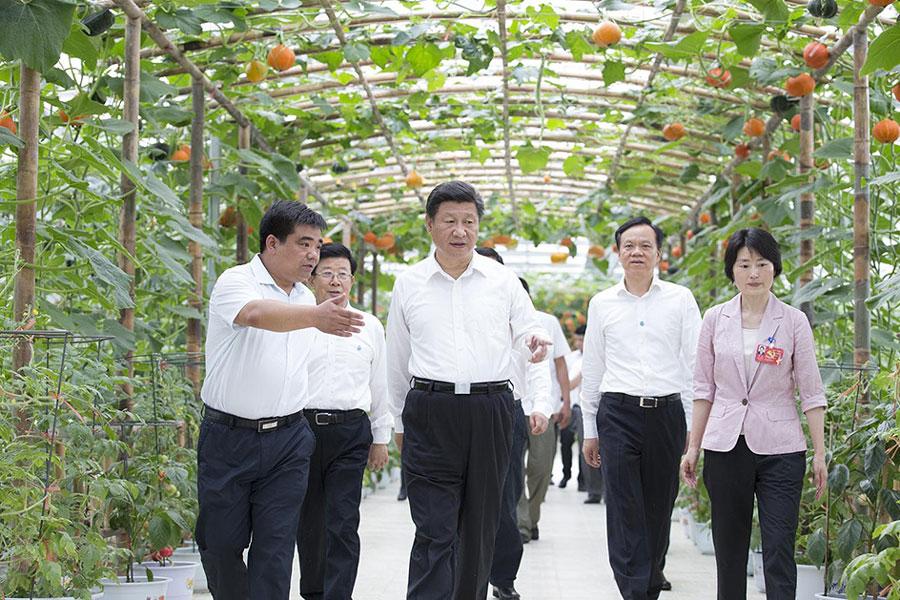 Chinese President Xi Jinping inspects the temperature controlled greenhouse of an agriculture park in Zunyi, southwest China's Guizhou province, June 16, 2015. (Photo/Xinhua)