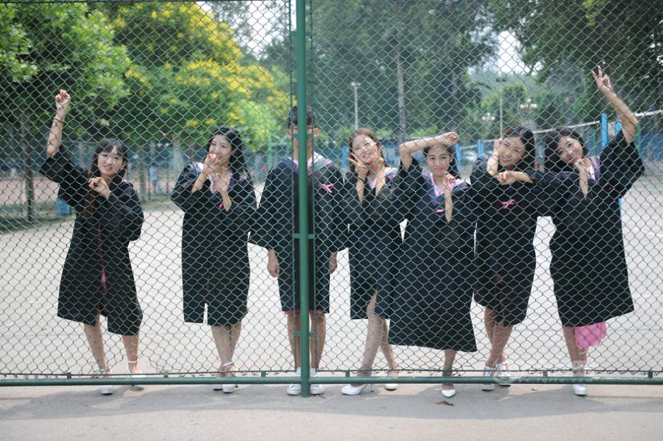 | Eye-catching college graduates wearing pink ribbons take photos in Shandong University. (Photo/www. iqilu. Com) |