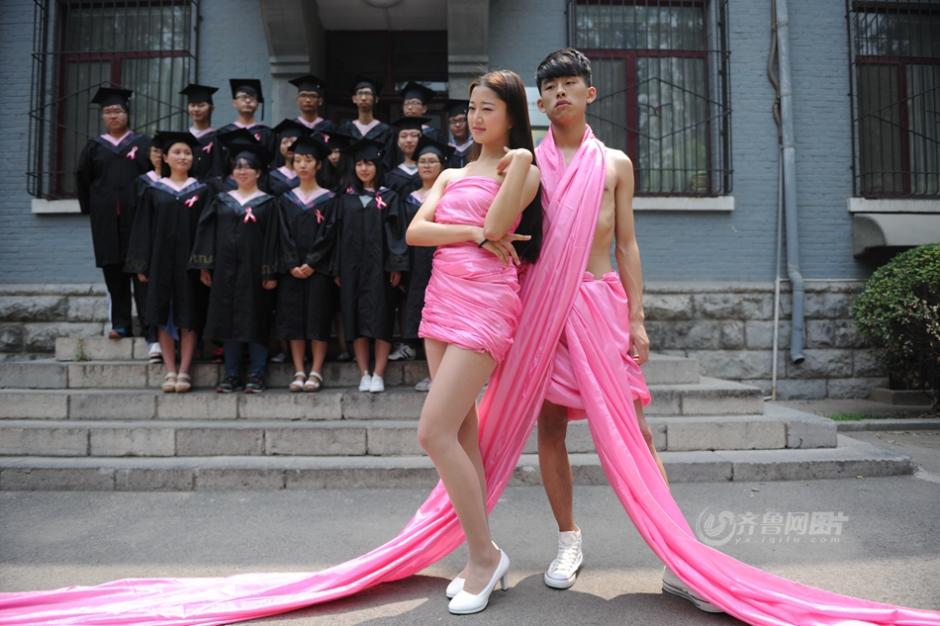 Eye-catching college graduates wearing pink ribbons take photos in Shandong University. (Photo/www. iqilu. Com)