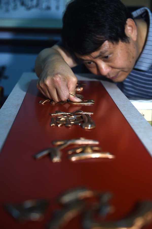 Zheng Shushan, a master of “Wushan Iron Calligraphy”, creates iron calligraphy works in his studio on June 16, 2015. (Xinhua/Xie Chen)