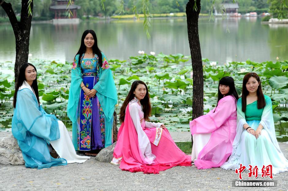 | College students take graduation photos in costumes of Han and Tang Dynasties at Tang Paradise in Xi'an, capital of northwest China's Shaanxi province, June 14, 2015. (CNS/Zhang Yuan) |