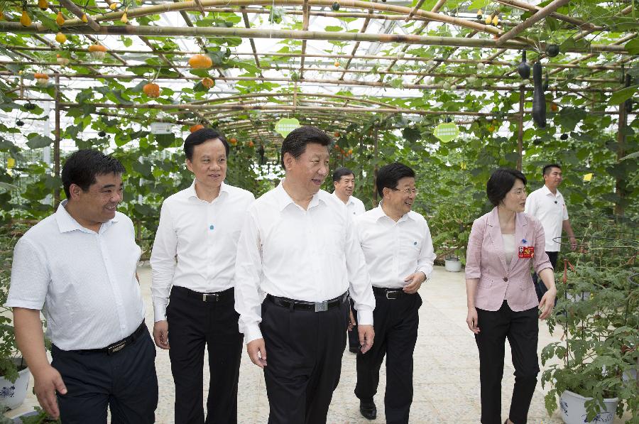 Chinese President Xi Jinping (3rd L) visits a greenhouse at Huamao Village of Fengxiang Township in Zunyi County, southwest China's Guizhou Province, June 16, 2015. Xi had an inspection tour in Guizhou Province from June 16 to 18. (Xinhua/Huang Jingwen)