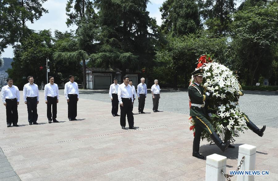 Chinese President Xi Jinping (front) offers a flower basket at the monument of a martyrs' cemetery in Zunyi, southwest China's Guizhou Province, June 16, 2015. Xi had an inspection tour in Guizhou Province from June 16 to 18. (Xinhua/Li Xueren)