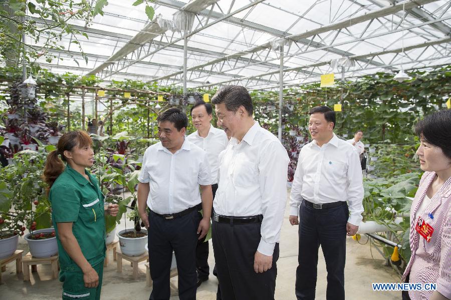 Chinese President Xi Jinping (3rd R) visits a greenhouse at Huamao Village of Fengxiang Township in Zunyi County, southwest China's Guizhou Province, June 16, 2015. Xi had an inspection tour in Guizhou Province from June 16 to 18. (Xinhua/Huang Jingwen)