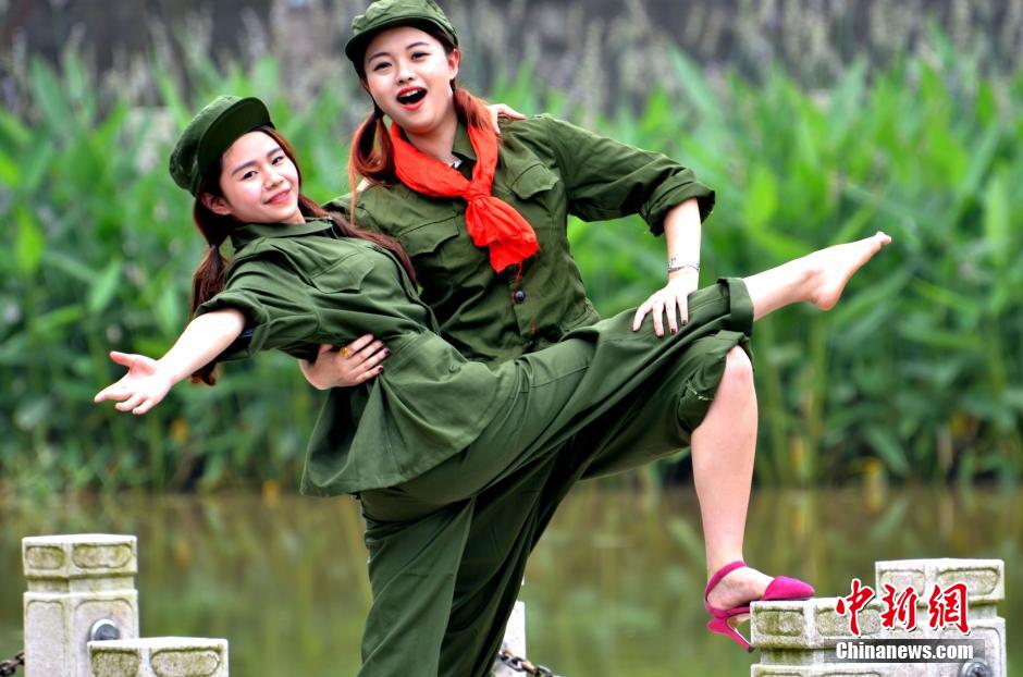 Several senior students wearing safety and industrial costumes take photos in Sichuan Arts and Science University. (CNS/Zhang Ji)