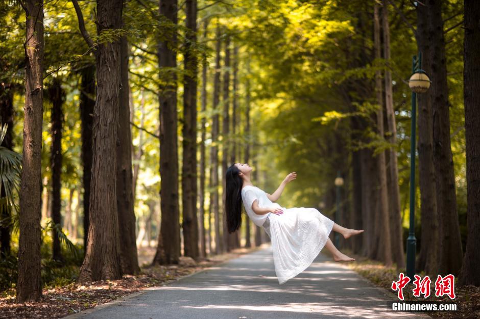 Xiao Ge takes amazing shots of herself floating in the air. Xiao Ge is a dancer from POLE 11, China's first pole dance girl group.(Photo/Chinanews.com)
