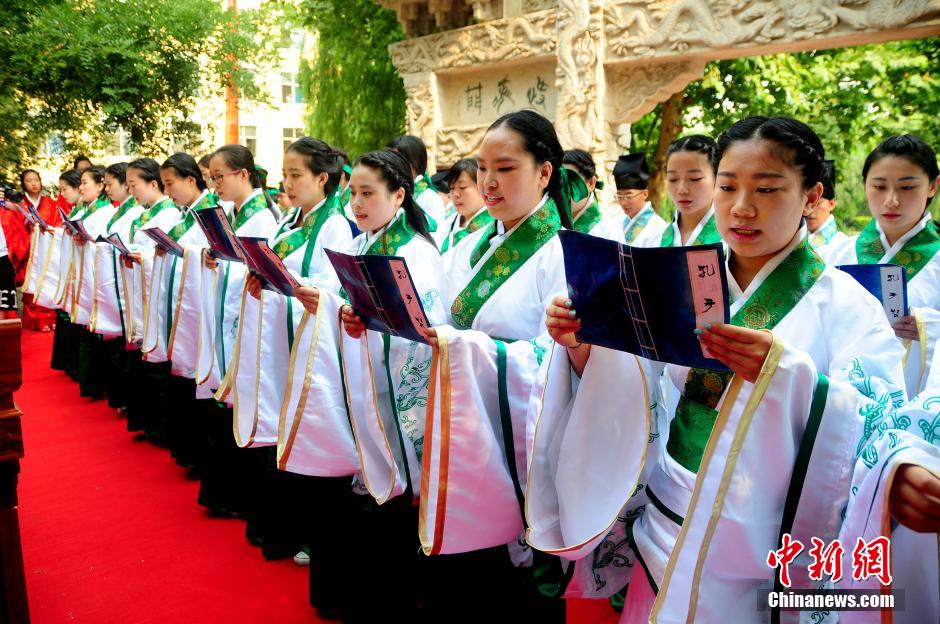 659 students and school leaders wear Hanfu (traditional clothing of the Han Chinese people) at the graduation ceremony held at Hebei Academy of Fine Arts on June 16, 2015. (CNS/Jia Minjie)