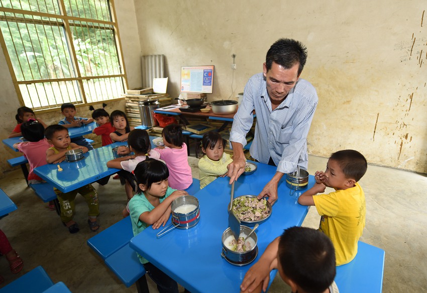 Liang Zhengwen distributes lunch to the pupils on June 16. (Photo/ Xinhua)