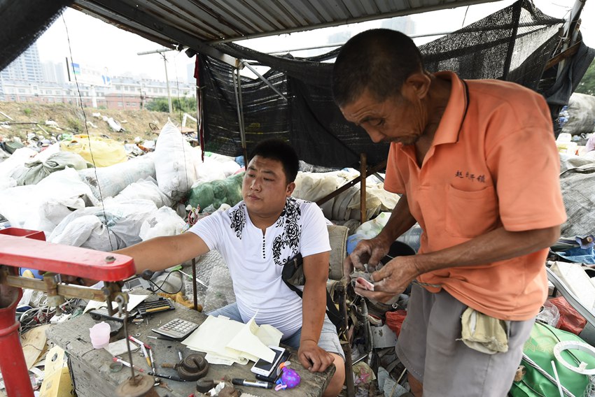 Zhou Baozhong earns about 20 yuan by selling the scraps he collected all the day on June 16. (Photo/Xinhua)