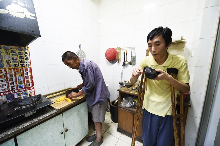 Zhou Yong (L) helps his father to cook the meal on June 16. (Photo/Xinhua)