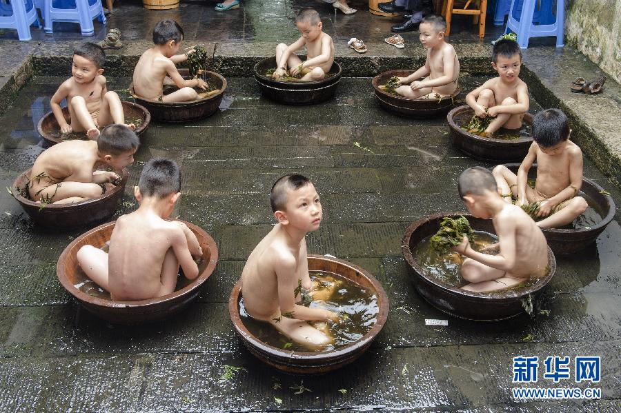 Children bathed in folium Artemisia argyi water in Zigui, hometown of famous Chinese poet Qu Yuan on Tuesday.(Photo/Xinhua)