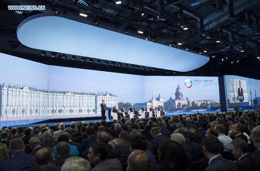 Chinese Vice Premier Zhang Gaoli (1st L) addresses the 19th St. Petersburg International Economic Forum in St. Petersburg, Russia, June 19, 2015. (Xinhua/Gao Jie)