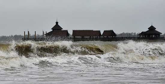 | Big waves surge at the Gaolong Bay in Wenchang, a coastal city in south China's Hainan Province, June 22, 2015. Tropical storm Kujira strengthened into a typhoon in the South China Sea on Sunday, which is moving northward and likely to become the first typhoon to hit China this year. (Xinhua/Guo Cheng) |