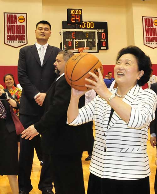 | Vice-Premier Liu Yandong shoots for the hoop at NBA basketball team Houston Rockets' home court Toyota Center watched by former Rockets star Yao Ming. A group of Chinese student athletes from Tsinghua High School are working on a basketball training program with the Rockets. Liu will attend the 7th China-US Strategic and Economic Dialogue in Washington on Tuesday. [Photo by Zhang Yongxing / Xinhua] |
