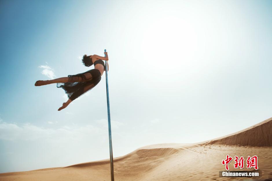 Fang Yi takes promotion photos for pole dancing in desert. (Chinanews.com/Yuan Biao)