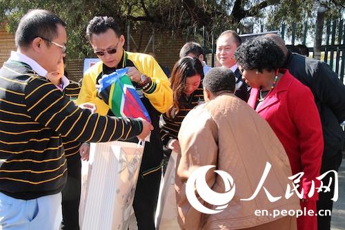 | Local Chinese community hand out packages for children to Bovet Primary School, on June 19th, 2015. (Photo: People’s Daily Online / Zhang Jiexian) |